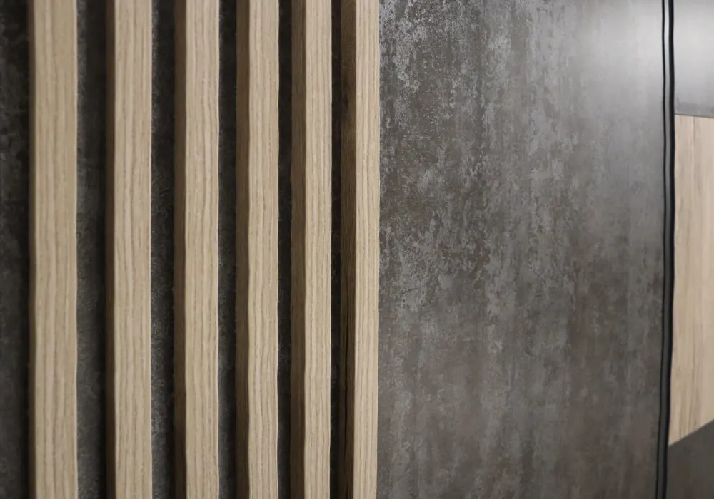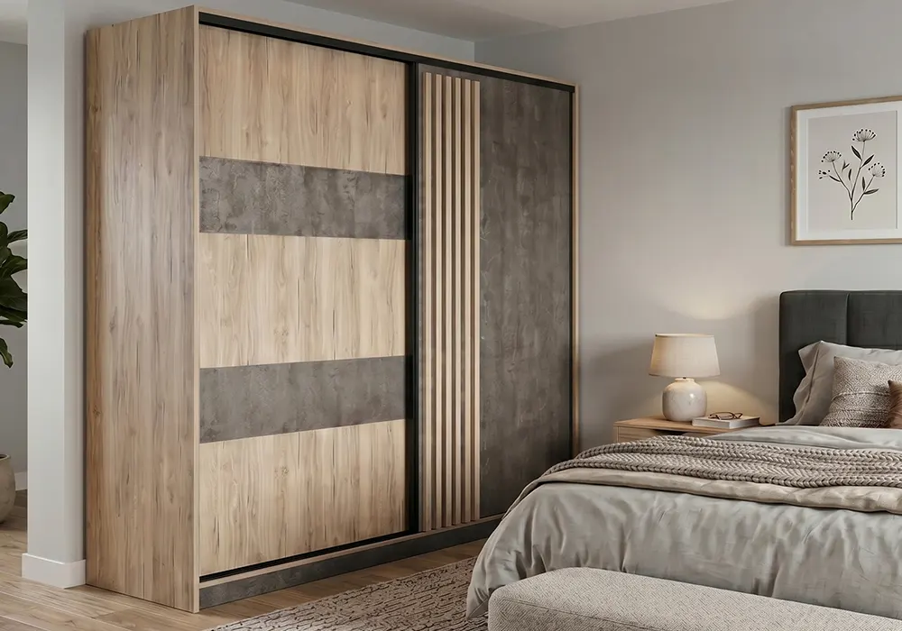 Δίφυλλη συρόμενη ντουλάπα με ξύλο και όψη βιομηχανικού τσιμέντου.
