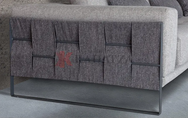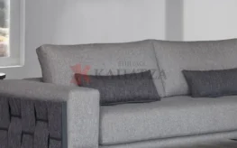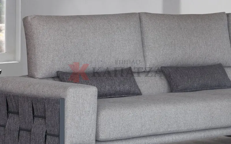 Στο ένα μπράτσο του καναπέ υπάρχει μια ενδιαφέρουσα λεπτομέρεια με πλέξη σε γεωμετρικό σχέδιο, προσδίδοντας ένα μοναδικό χαρακτήρα.