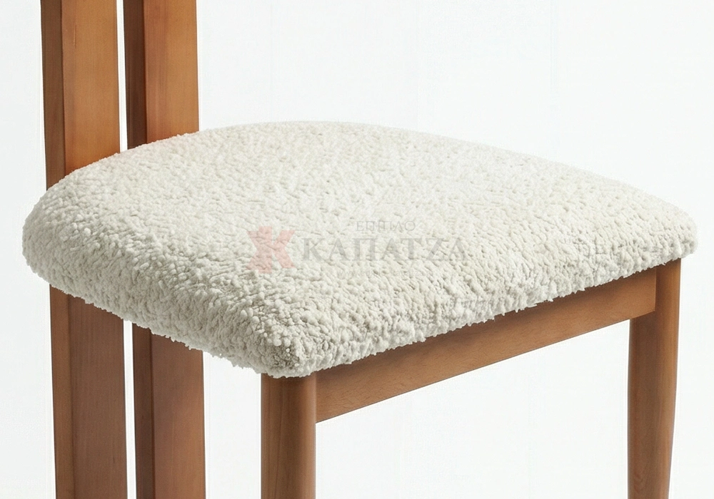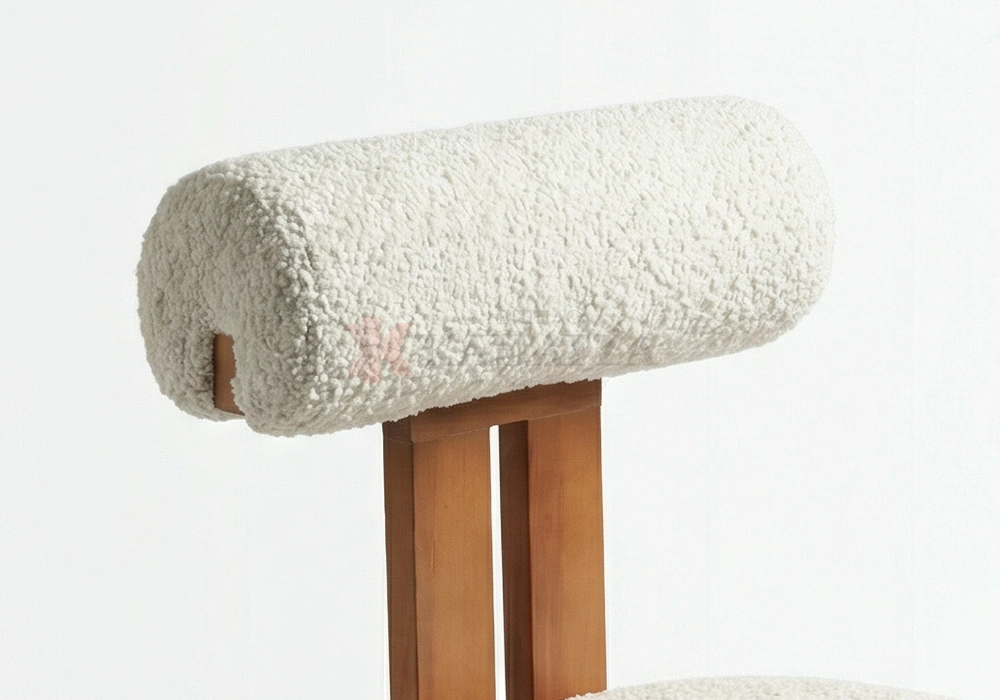 - Πολυτελές Ύφασμα Bouclé: Το κάθισμα και η κυλινδρική πλάτη είναι επενδυμένα με υψηλής ποιότητας ύφασμα bouclé σε off-white απόχρωση, προσφέροντας απαλή υφή και “ζεστή” αίσθηση.