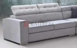 Η δεξιά πλευρά διαθέτει προέκταση τύπου “chaise longue”, ιδανική για στιγμές χαλάρωσης, ενώ οι μεταλλικές λεπτομέρειες στη βάση προσθέτουν ένα μοντέρνο και κομψό άγγιγμα.