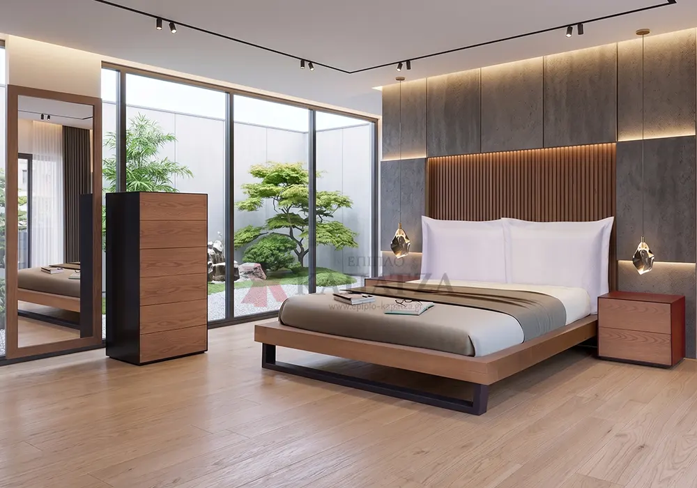 Ολοκληρωμένο σύνολο: Κρεβάτι, 2 κομοδίνα, ψηλή συρταριέρα, ολόσωμος καθρέπτης.