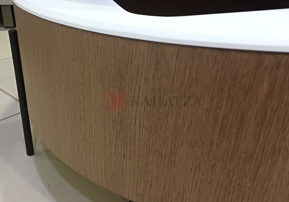 Η βάση του είναι επενδυμένη με ξύλο δρυ σε φυσική απόχρωση, προσδίδοντας ζεστασιά και κομψότητα, ενώ στηρίζεται σε διακριτικά μαύρα μεταλλικά πόδια για σταθερότητα και μοντέρνο στυλ.